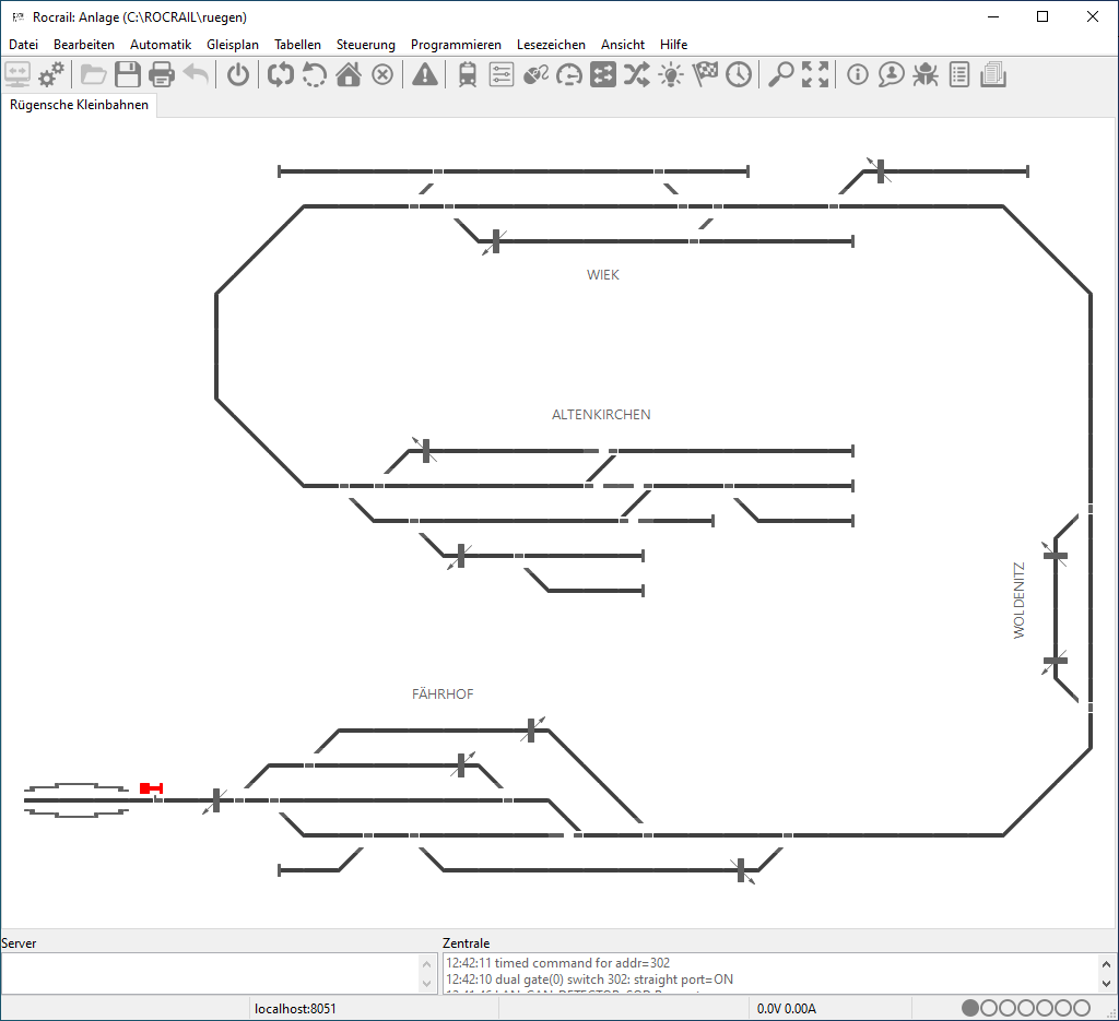 Da bisher(!) keine Rückmeldung geplant ist und somit die normale Darstellungsweise nicht unbedingt Sinn ergibt und mir auch nicht gefällt, bin ich etwas tiefer in die Materie der Gleisplanerstellung und -darstellung eingetaucht. Bei einigen Problemen hat mir die Community im ROCRAIL-Forum weitergeholfen, so dass ein Gleisbildstellpult in Anlehnung an das EStW entstehen konnte.
