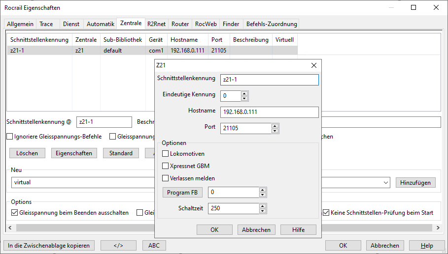 Zunächst habe ich das Beispiel der Schritt-für-Schritt-Anleitungen durchgespielt und dann einen eigenen Arbeitsbereich angelegt und erst einmal die Zentrale eingerichtet, wobei ich zunächst bei den ROCRAIL Eigenschaften die vorhandene virtuelle Zentrale gelöscht und als neue Zentrale die Z21 ausgewählt und hinzugefügt habe. Bei den Eigenschaften der Zentrale muss im Prinzip nur die Schnittstellenkennung z21-1 und die IP-Adresse der Zentrale eingegeben werden. Alle anderen Einstellungen sind für mich und ROCRAIL zunächst unrelevant.