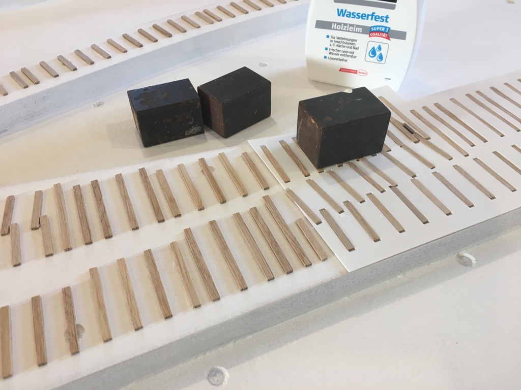 Danach habe ich mit Hilfe von Schablonen die Schwellen mit wasserfestem Holzleim aufgeklebt. Während des Trocknens wurden die Schwellen mit Gewichten beschwert, um den den Anpressdruck etwas zu erhöhen.