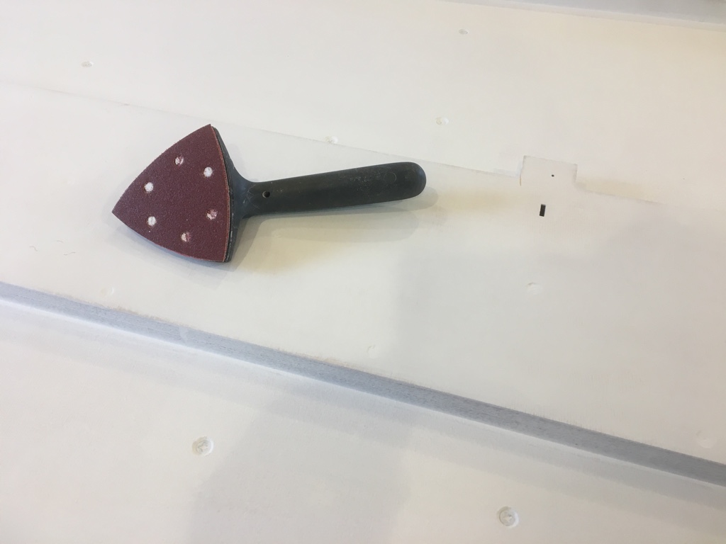 Dafür habe ich zunächst die lackierten Oberflächen der Trassen angeschliffen, in der Hoffnung, dass der Holzleim eine bessere Verbindung zwischen Trassen und Schwellen eingeht.