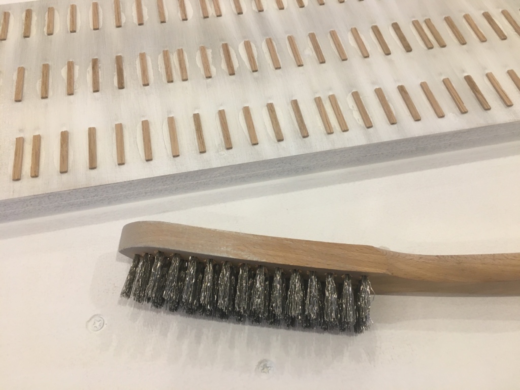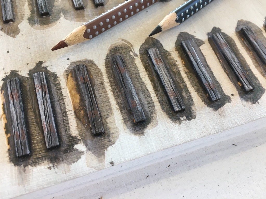 Als erstes habe ich mit einer Stahlbürste die Schwellen in Längsrichtung (der Maserung) malträtiert, so dass die Maserung mehr hervorsticht und es so aussieht, wie altes vertrocknetes Holz.