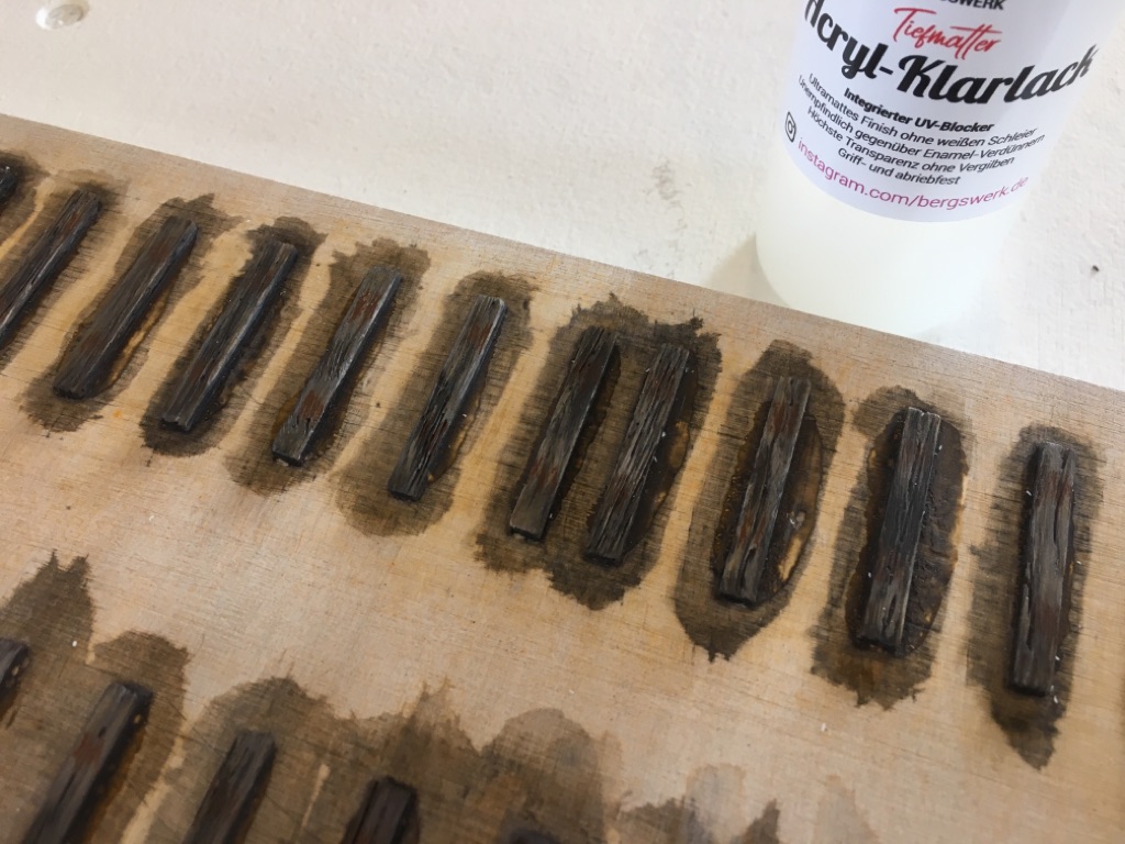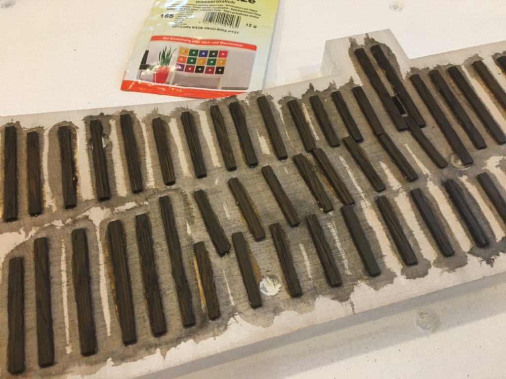 Soweit vorbereitet, habe ich als nächstes die Schwellen mit wasserlöslicher Beize von Clou (Eiche dunkel, Nr. 165) gebeizt. (Ob wasserlösliche Beize eine gute Wahl war, ist fraglich. Gegebenenfalls muss ich die Schwellen später insgesamt nochmals nachfärben.)