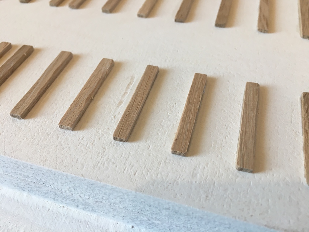 Nach dem Trocknen habe ich den Schwellen mit Gouache Color weiß – wasserlöslicher Farbe (schon wieder!) – einen Grauschleier verpasst. Im Prinzip ist es hier von Vorteil, wenn man kein künstlerisches Talent hat, denn so werden die Schwellen recht unregelmäßig, was im Endeffekt natürlicher aussieht.